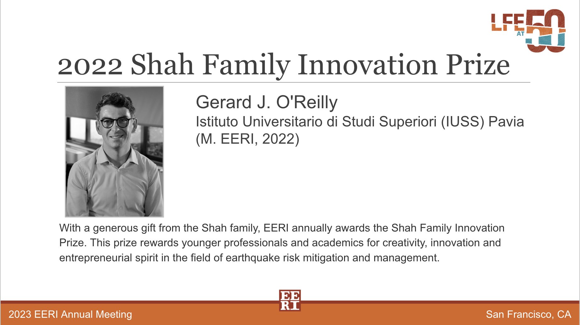 - 13/04/2023 - Gerard was presented with the 2022 Shah Family Innovation Prize from the Earthquake Engineering Research Institute at the Annual Meeting in San Francisco, California [Twitter][Photo 1][Photo 2][Photo 3][Photo 4]